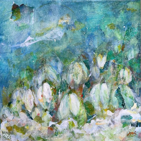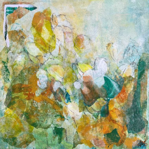 Julie (JM) Spence is an acrylic painter and mixed media artist, working on a variety of surfaces including canvas, board, and paper. She loves the playful use of colour and graphic forms to express emotion and movement. She is self taught and has benefited greatly from the guidance of Mastrius Mentors and the support of the Mastrius community. “I am drawn to the use of layered materials and mixed media to form representations of emotions, interactions, and space. I love colour and texture; I strive to create complex surfaces within each piece. These pieces are part from a larger body of work entitled Beneath the Surface There is Life, in which I exam the depths of ponds and lakes.”