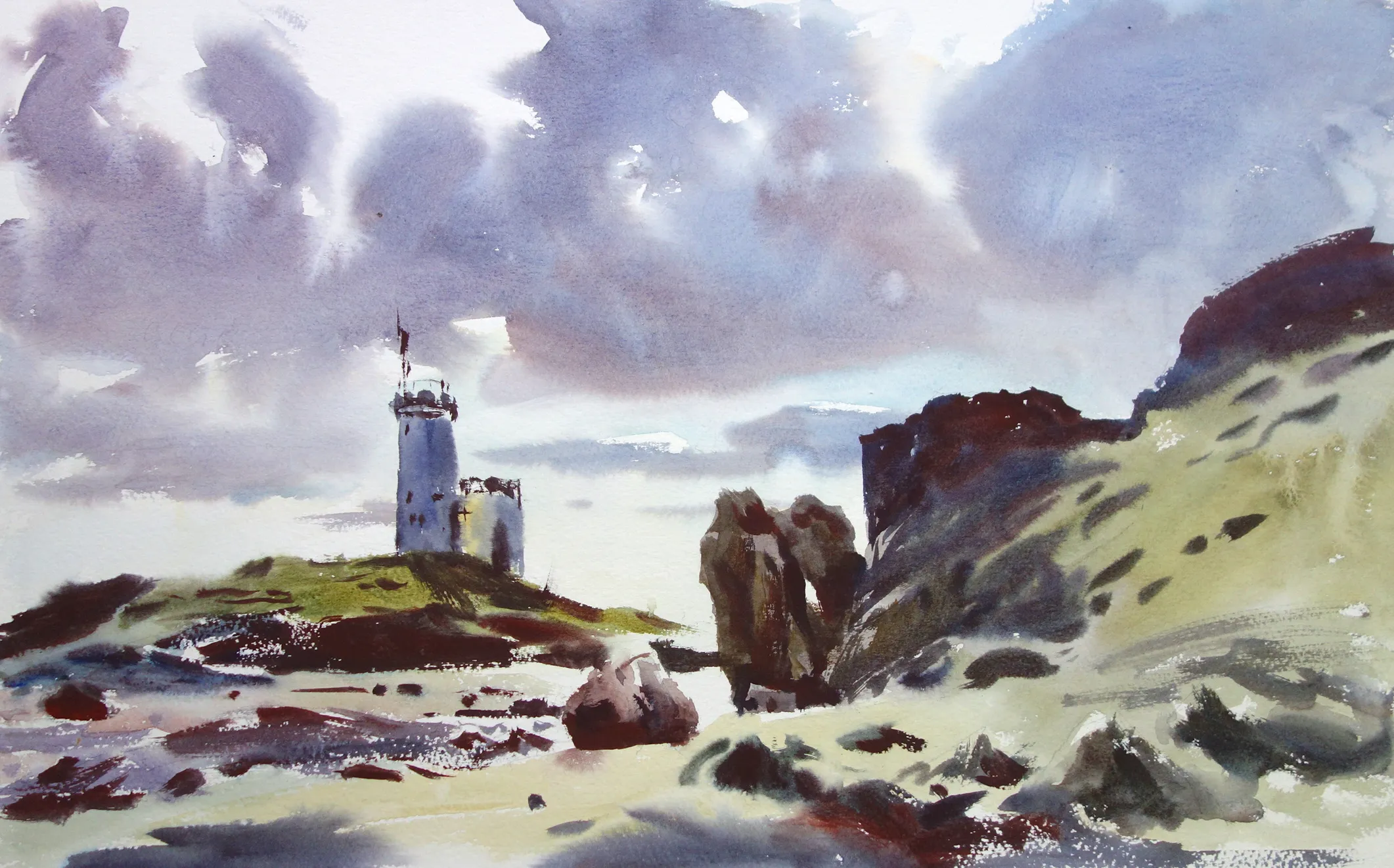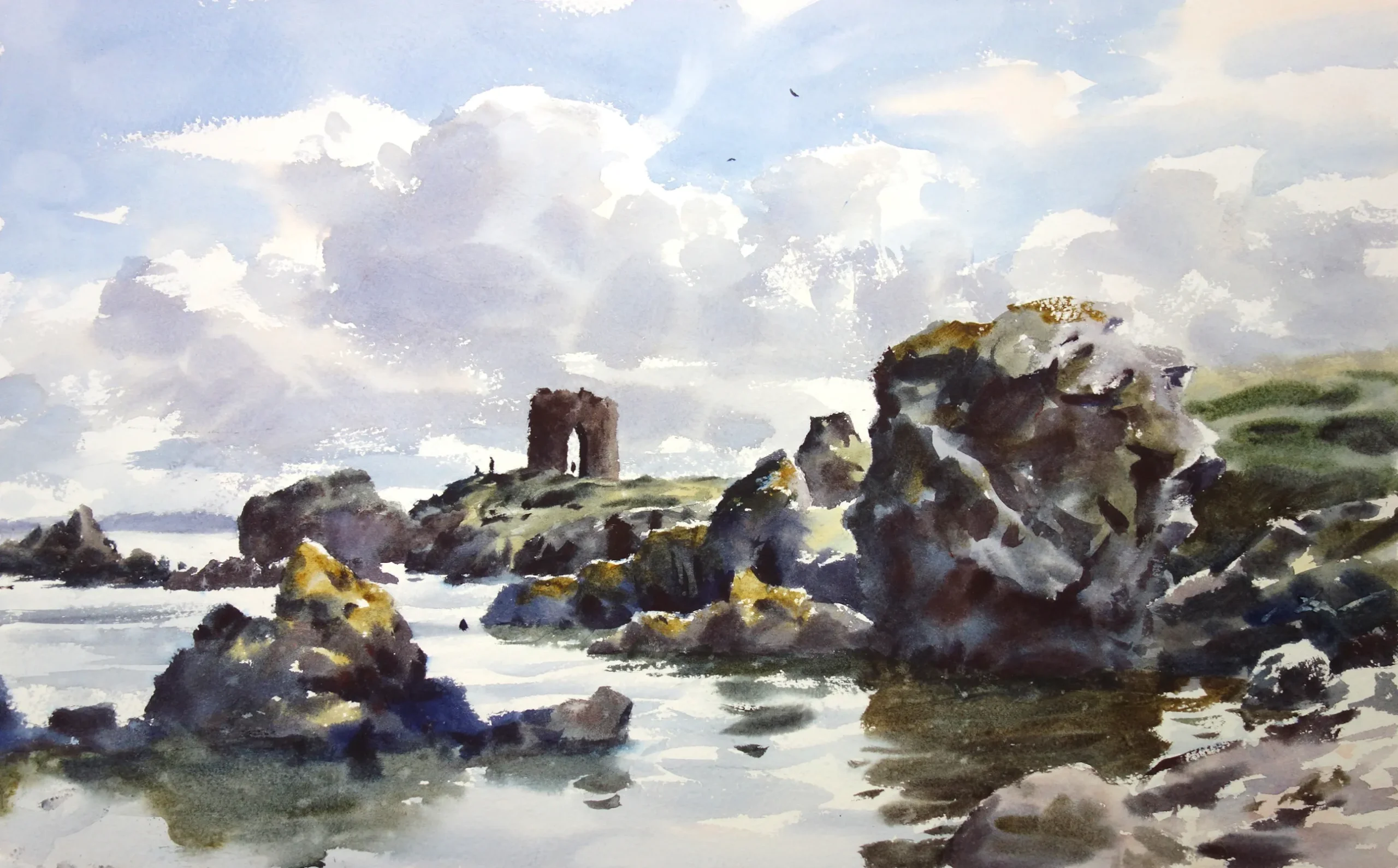 Jem’s ‘direct’ approach to watercolor requires acceptance of uncorrected ‘mistakes’, embracing a degree of hit and miss in the process, but always vitality in the results. It may be enjoyed by those wishing to develop a ‘loose’ or impressionistic approach to capturing atmosphere in landscape watercolor.